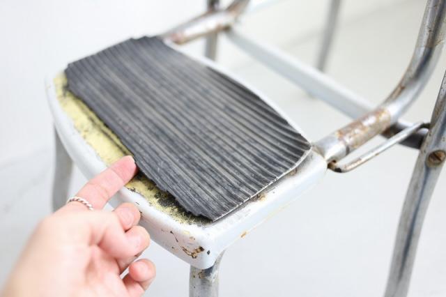アメリカ買付のメタルステップスツールです。座面下のステップを手前日引き出すと小さな脚立に早変わり。スツールと脚立が一体化した実用的なアイテムです。例えばキッチンに置いて高いところに手を伸ばしたいときのステップ利用はとても便利ですし、他、カウンターやガレージ、お花を置く台としてなど、様々な用途で使える家具です。