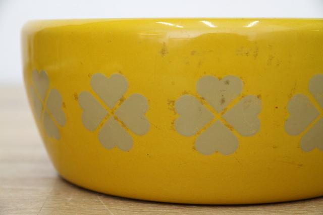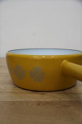 スイスメイドのホーローの鍋。クローバーの模様がぐるっと一周プリントされています。観葉植物と合わせてインテリアに使うアイデアもオススメいたします♪