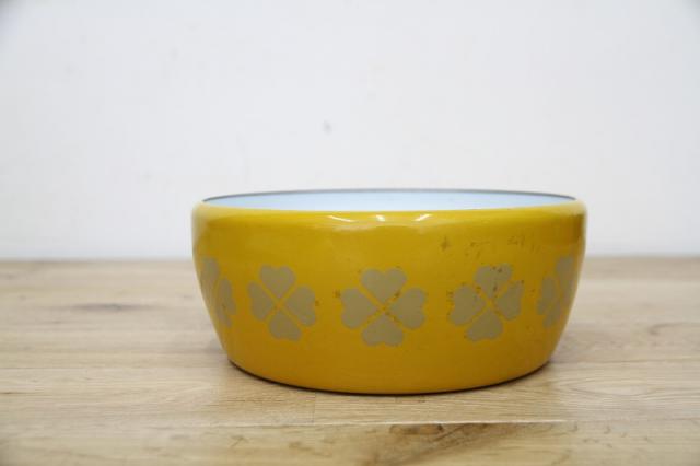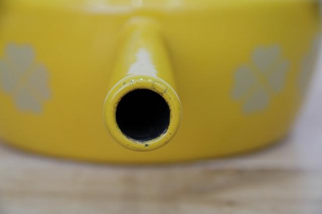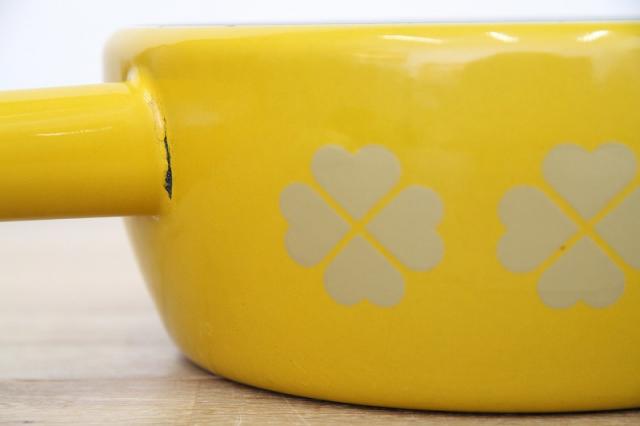 スイスメイドのホーローの鍋。クローバーの模様がぐるっと一周プリントされています。観葉植物と合わせてインテリアに使うアイデアもオススメいたします♪