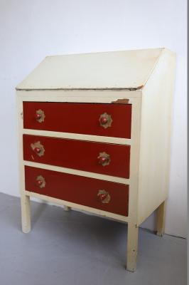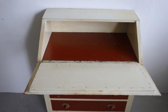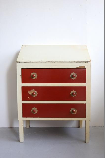 デンマークで見つけたチェスト。上段の扉を手前に引っ張ると大きな収納スペース、そして引き出し収納が3段というデザイン。赤と白のカラーペイントがどこか懐かしいようなレトロ感ある仕上げの可愛い家具です。