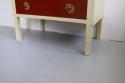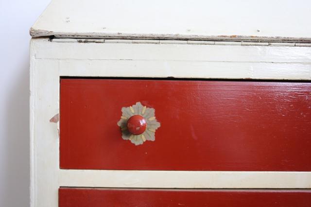 デンマークで見つけたチェスト。上段の扉を手前に引っ張ると大きな収納スペース、そして引き出し収納が3段というデザイン。赤と白のカラーペイントがどこか懐かしいようなレトロ感ある仕上げの可愛い家具です。