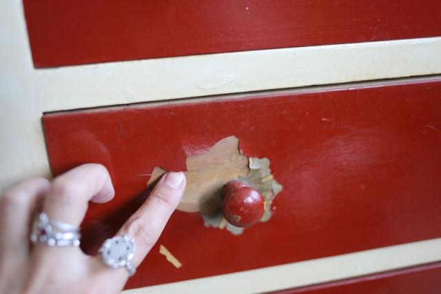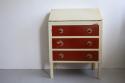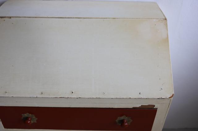 デンマークで見つけたチェスト。上段の扉を手前に引っ張ると大きな収納スペース、そして引き出し収納が3段というデザイン。赤と白のカラーペイントがどこか懐かしいようなレトロ感ある仕上げの可愛い家具です。