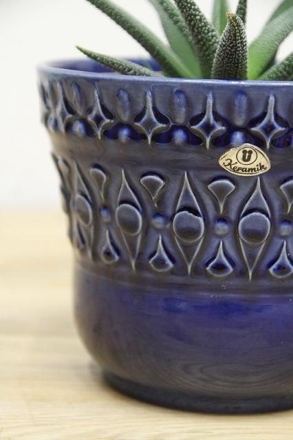 西ドイツU-Keramik社の陶器製フラワーポット。透き通るような青の色がとても美しいです。