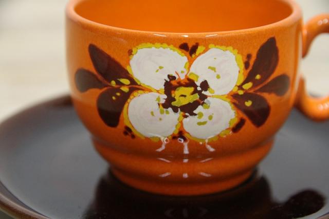 Winterling社1970年代製のヴィンテージ品です。オレンジ×ブラウンの色使いとフラワーモチーフがレトロ感を引き立たせるデザインです。