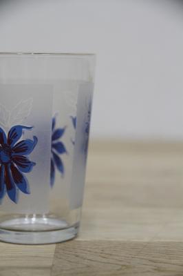 1970年代製のヴィンテージジュースグラス。レトロなフラワープリントが引き立つデザインです。