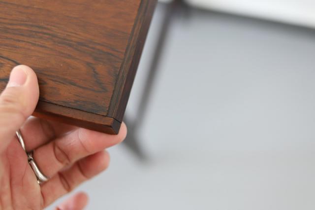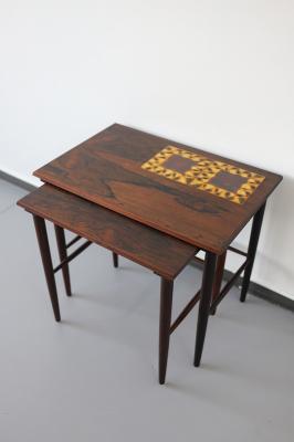 北欧デンマーク製のネストテーブルです。ネストとは「入れ子」の意味があることばで、大きなサイズのテーブルに小さなサイズのテーブルがきれいに収まるつくりの家具です。ワンポイントのタイルがデザインのポイント。力強いローズウッドの木目も雰囲気が出ます。