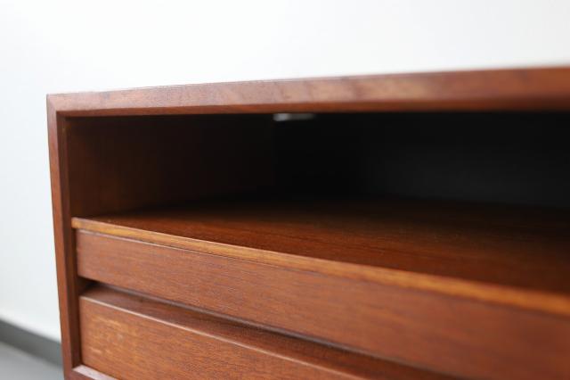 コンパクトさが際立つこちらのチェストは北欧デンマーク買付のもの。マンションや狭いスペースにもピッタリなサイズ感です。木目美しいチーク材の艶やかさが贅沢な雰囲気。引き出し収納や裏面も贅沢に材料が使われ、コンディションが良い一台です。