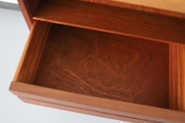 コンパクトさが際立つこちらのチェストは北欧デンマーク買付のもの。マンションや狭いスペースにもピッタリなサイズ感です。木目美しいチーク材の艶やかさが贅沢な雰囲気。引き出し収納や裏面も贅沢に材料が使われ、コンディションが良い一台です。