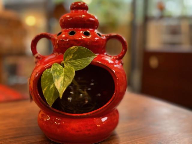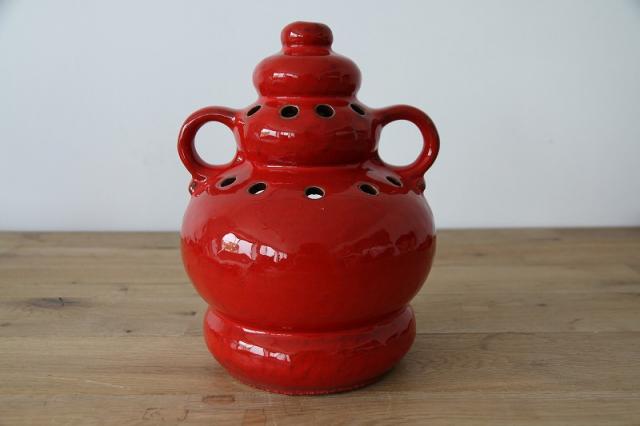 ドイツで見つかった陶器製のキャンドルホルダー。赤の釉薬の色がとても印象的です。