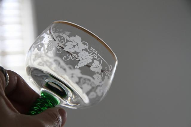 ドイツの伝統的なワイングラス「Romer Glass」レーマーグラスです。葡萄の絵柄や段々が付いたグラスの脚部分がデザインの特徴です。