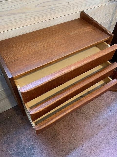 デンマークの買付で入荷した小ぶりでシャープな3段チェストです。