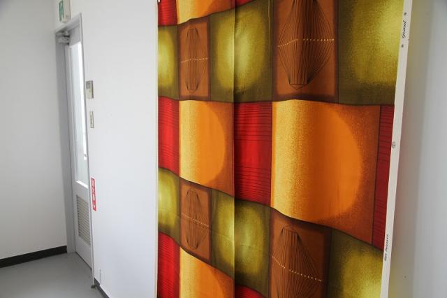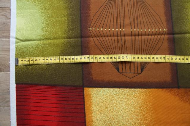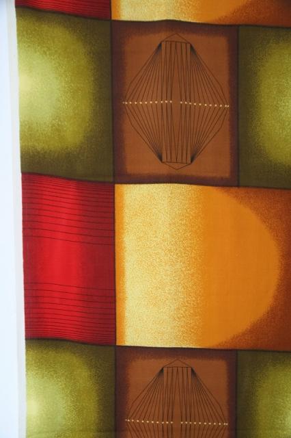 レトロな配色が素敵なカーテンファブリックです。素材は100%ポリノジック(生地のミミにプリントされています)。レーヨンを改良して作られた繊維で美しい光沢感とドレープ感があるのが特徴です。繊維から1990年代くらいのものかと思われます。