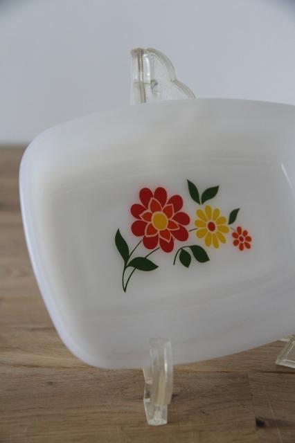 耐熱食器ミルクガラスで有名なフランスArcopal(アルコパル)の少し深さがあるお皿です。長方形型が良いです。フラワープリントがレトロで可愛い一点です。