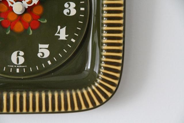 ドイツ製ヴィンテージの陶器製掛時計です。中央のフラワーモチーフとまるでお皿のようなフォルムがユニークな一点です。