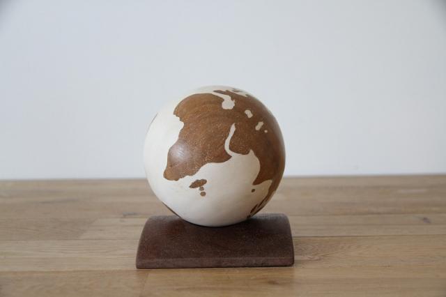 ウッドの台座に、天然木と樹脂を使用した地球儀をセットできます。