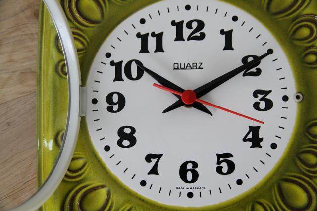ドイツ製ヴィンテージの陶器製掛時計です。鮮やかなライムグリーンの色が目を惹きます。ぽってりとしたフォントとプラスチック製の針がレトロさを増してくれています。