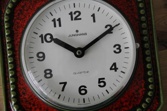 ドイツJUNGHASN社製の陶器製掛時計。レッド、グリーン、ブラックの色使いが渋くて惹かれる一点。グリーンピースのような飾りのデザインが可愛いですよ。