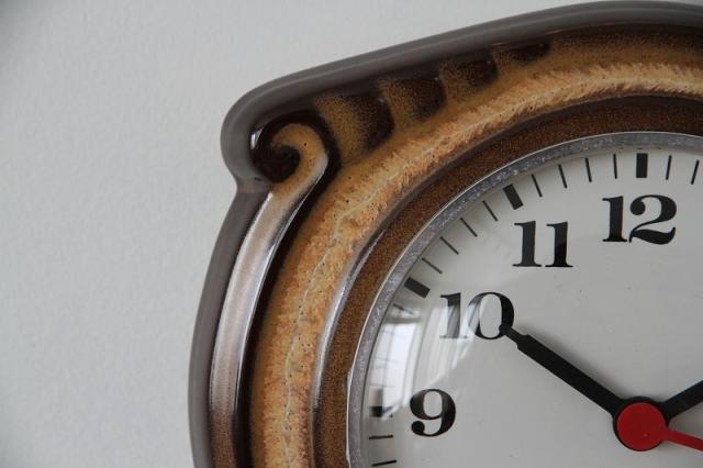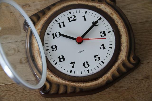 ドイツヴィンテージの陶器製掛時計。ブラウンとベージュを基調としたシンプルな色使いです。(個人的にはなんだかネコバスみたいだ・・・と思いました♪)文字盤にWESTERN GERMANYの刻印あり、です。
