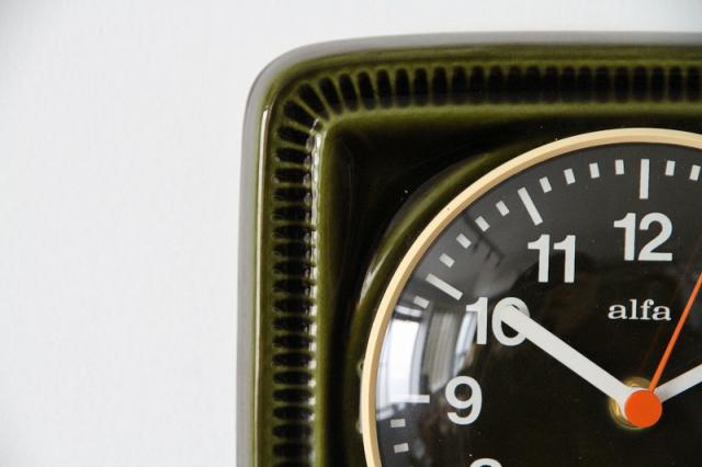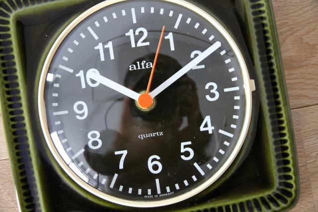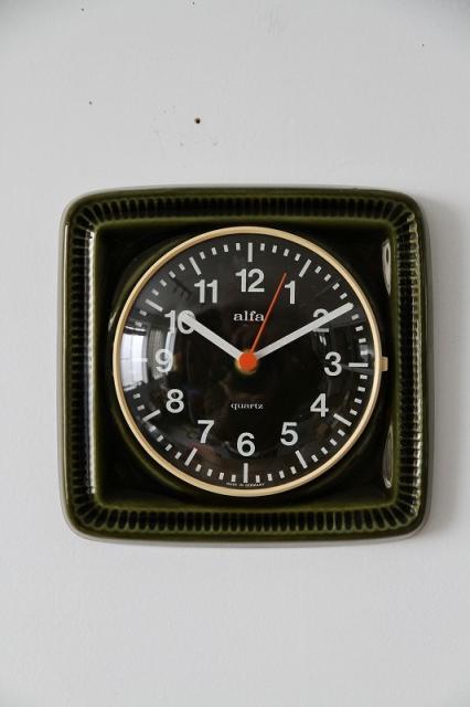 ドイツ製ヴィンテージの陶器製掛時計です。文字盤も含め、深い緑の色が印象的な一点。緑や青など寒色系はなかなか貴重です。