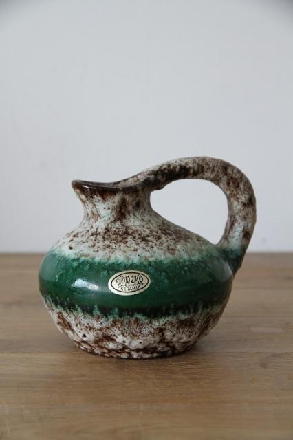 西ドイツにて製造されていた'Fat Lava'と呼ばれる陶磁器で、1848年創業と言われているJopeko社製のフラワーベースです。軽石のように凹凸ある釉薬と艶感ある鮮やかな緑の色のバランスが素敵な一点です。