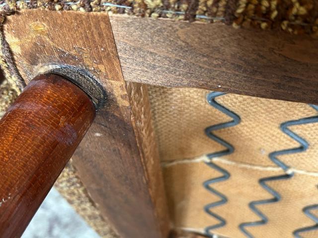 ●座面と脚の接着部分にぐらつきがありましたので補強修理しています。若干のガタツキがありますので、脚先にフェルトシールを貼るなどして調整してください。