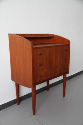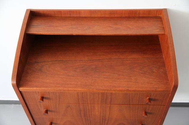 北欧デンマーク製のチーク材を使用した3段チェスト。3杯の引き出しを備え収納力もあり、上段も2段に分かれているつくりです。シンプルながらもデザイン性を兼ね備えた一台です。