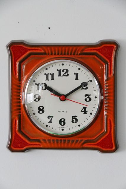 ドイツヴィンテージの陶器製掛時計です。お部屋を明るく照らしてくれるような鮮やかなオレンジ色が魅力的な一点です。