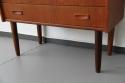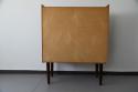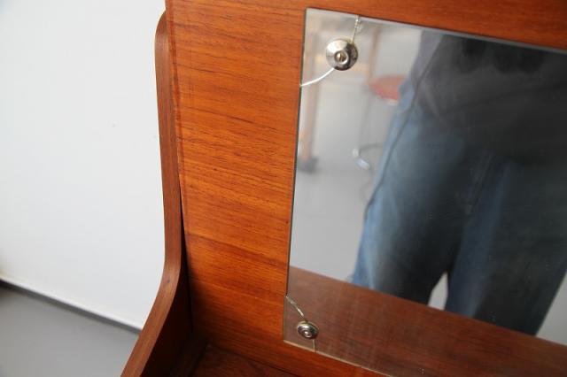 北欧デンマーク買付のライティングビューローです。ビューローとは、書棚や引き出しなどの収納家具とデスクが一体化した家具のことをいいます。これは天板を手前に引き出すことでデスクとして使用することが出来るタイプのデザインです。その天板を持ち上げると鏡が付いている仕様です。