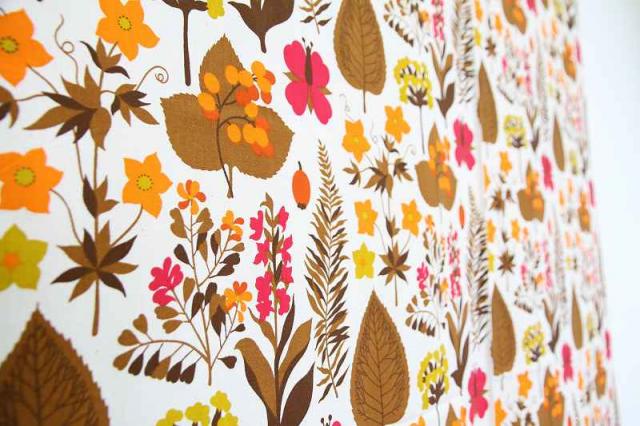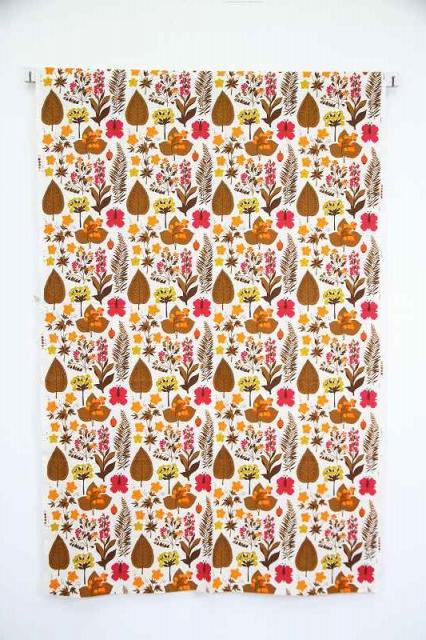 ドイツで見つけたボタニカル柄のヴィンテージファブリックです。全体的に草花がプリントされた生地。日本だったら、紅葉シーズンにピッタリすぎる色合いですね。カーテンやタペストリーなど、お部屋のインテリアに取り入れることもおススメです。