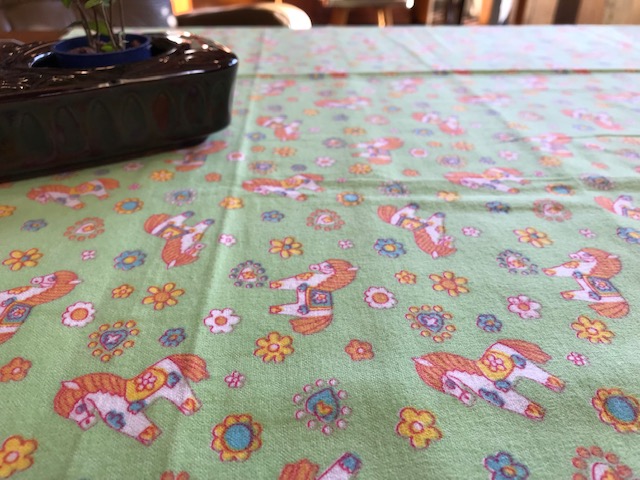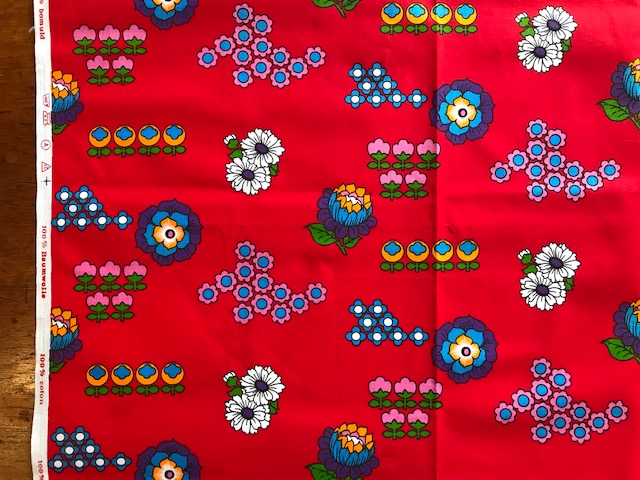 太陽のような賑やかなフラワープリントが素敵なヴィンテージファブリック。オランダで見つかったものです。ジャージ素材のような、伸びやすい質感です。ブラッドオレンジのような色にグリーンの配色がなんとも賑やかで明るい気持ちにさせてくれるデザインです。