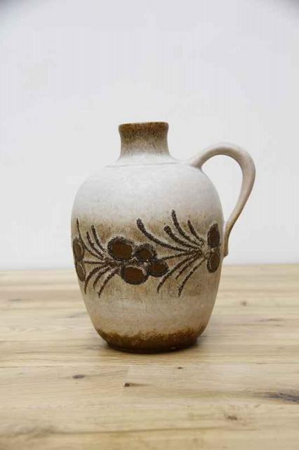 ドイツ製のヴィンテージフラワーベースです。陶器製です。木の実のような模様が立体的にぐるりと描かれています。ずっしりと丸い、安定感あるフォルムです。口が小さいので、一輪挿しにも向いていると思います。全体的に落ち着いた渋い雰囲気の花瓶なので、お部屋に合わせやすく、和室インテリアにもおススメです。
