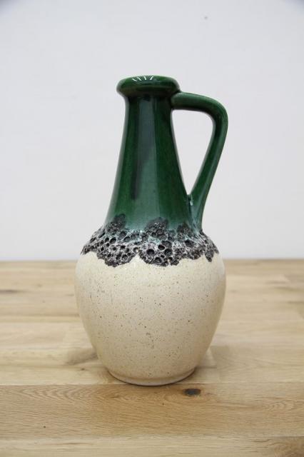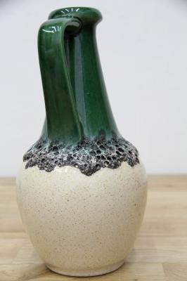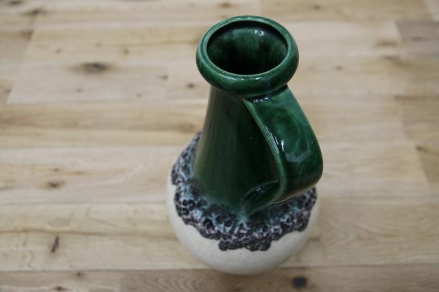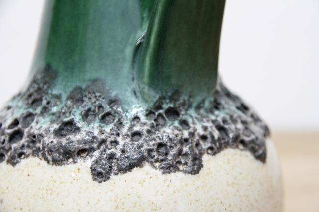 西ドイツにて製造されていたFatlavaという名がついた陶磁器、BAY Keramik社製のフラワーベースです。たまごのような形からスラリと伸びる口までのデザイン、濃い緑の色が目を惹きます。泡のような黒いボコボコとした釉薬の仕上がりもFatLavaらしい特徴が出ています。