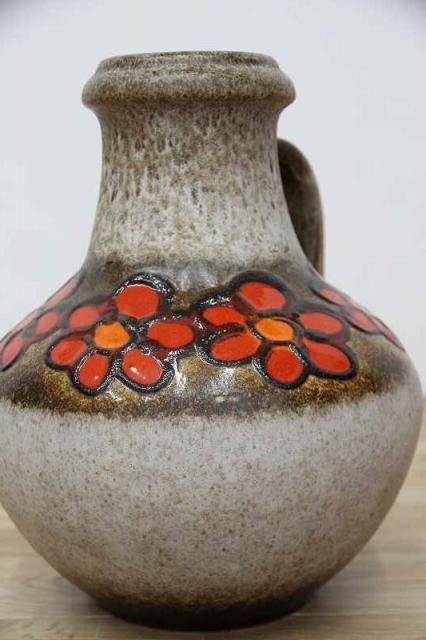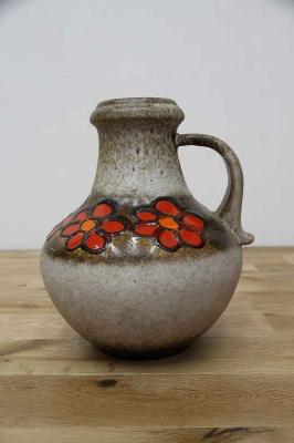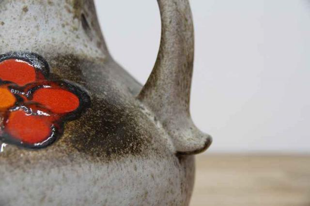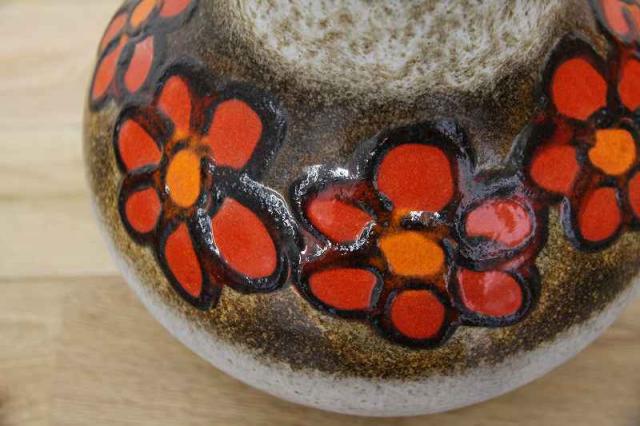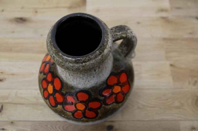 赤いお花が描かれた、賑やかなフラワーベース。西ドイツ生まれのFatLavaと呼ばれる陶磁器で、Scheurich社製のものです。どっしりとした重厚感あるデザイン。茶色ベースに映えるお花が目を惹きますね。お部屋を華やかに彩ってくれる花瓶です。
