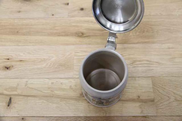 ヨーロッパでペストが大流行した際に生まれたといわれている蓋付きマグ。ハエがペスト菌を媒介するという説があり、ビールを飲んでいる最中にハエが入らないようにという理由から作られたそうです。蓋や親指で開け閉めできるような形状になっています。
