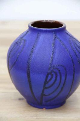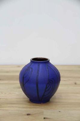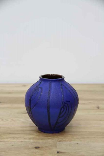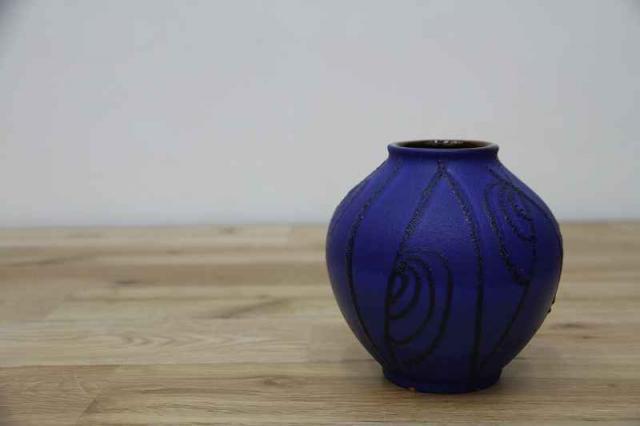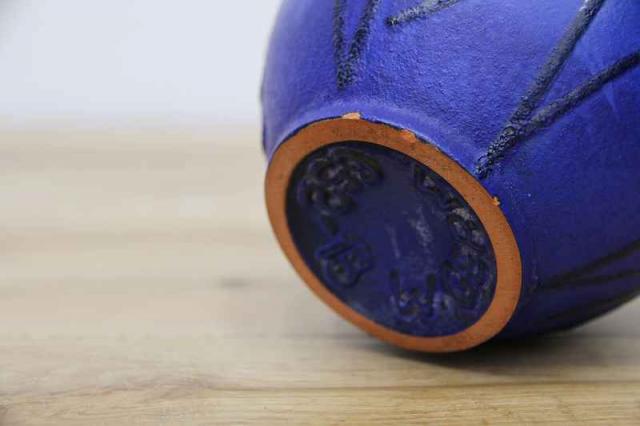 ドイツCarstens社製のヴィンテージフラワーベースです。全体的にマットな質感の深い青の色がとても印象的。凹凸感のある黒のラインで模様が描かれています。花瓶ですが、アート作品のように楽しめる、ドイツ製ヴィンテージの花瓶です。