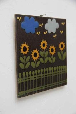 ドイツ製ヴィンテージのタイルの壁飾りです。太陽の光を浴びながら元気に育っている向日葵のようなお花が並んだデザイン。おそらくですが、前の持ち主さんがタイルを壁飾り用にカスタムしたのではないかと思います。壁が傷つかないように、コルクが貼ってあったり、大事にモノを扱う人だったのではないかなぁと、勝手に想像しています。