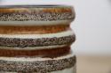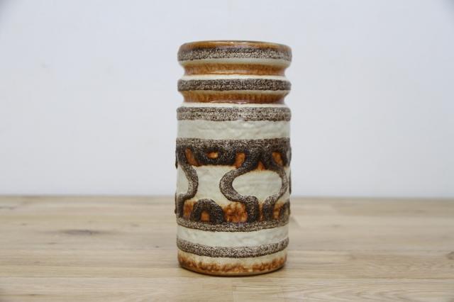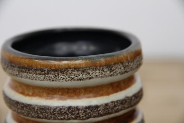 VEB Haldensleben社製のヴィンテージ品と思われます。東ドイツに拠点があった国営工場です。西ドイツ製のFatLavaに比べると落ち着いた雰囲気を感じます。白と茶色ベースのあたたかみあるボディに、凹凸感ある釉薬で縁取りされたような独特なデザインです。