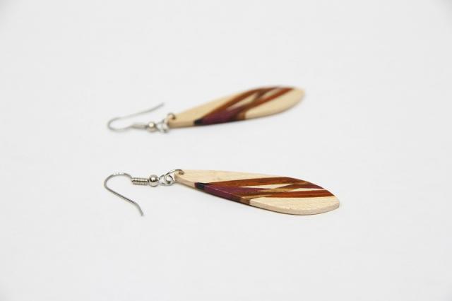1979年創業アメリカのクラフトメーカー“davin&kesler”のピアス。木が本来持つ色や木目を生かした組木デザインは非常に細やかで、しなやかな曲線も大変美しいです。木目の落ち着いた雰囲気は、どんなテイストのファッションにも合わせやすそうです。
