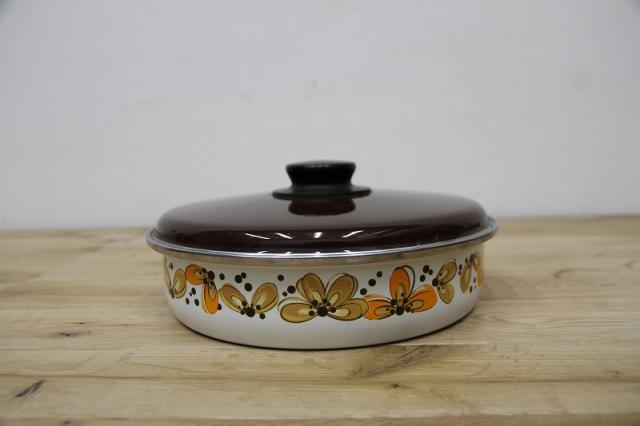 ヴィンテージの蓋つき片手鍋。レトロな花柄プリントとってもかわいく、鍋も浅めでそのまま食卓に並べたりもしやすい、とても使い勝手の良いサイズです。