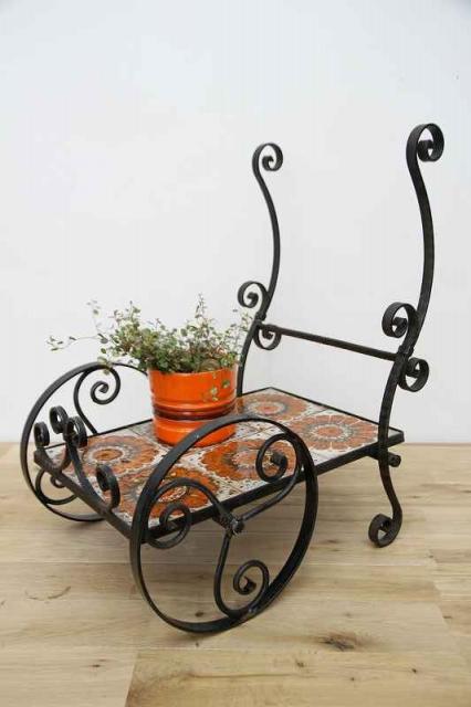 鉄製フレーム+タイルで作られたお花用のワゴン仕様フラワースタンドです。フレームは細やかな曲線でデザインされていて、大輪の花が描かれたタイルもとても印象的。こんな素敵な植物用スタンドをどう使おうか、考えるのがとっても楽しい時間になりそうですね♪