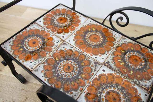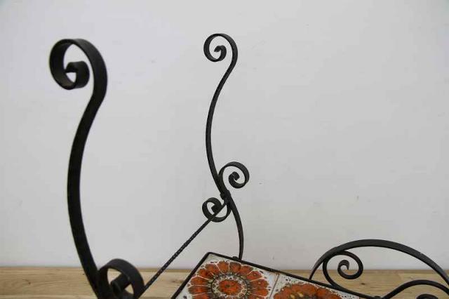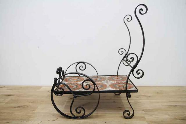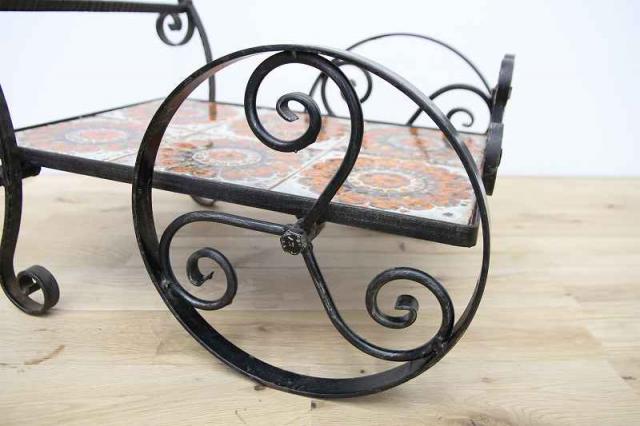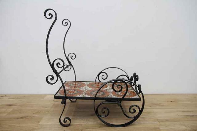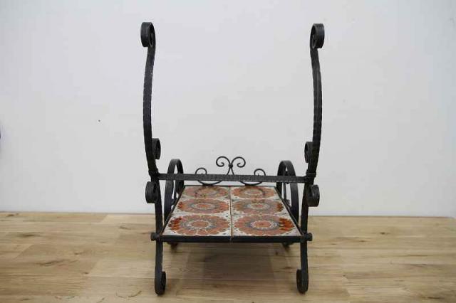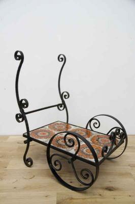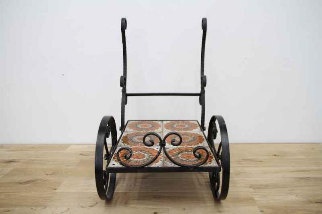 鉄製フレーム+タイルで作られたお花用のワゴン仕様フラワースタンドです。フレームは細やかな曲線でデザインされていて、大輪の花が描かれたタイルもとても印象的。こんな素敵な植物用スタンドをどう使おうか、考えるのがとっても楽しい時間になりそうですね♪