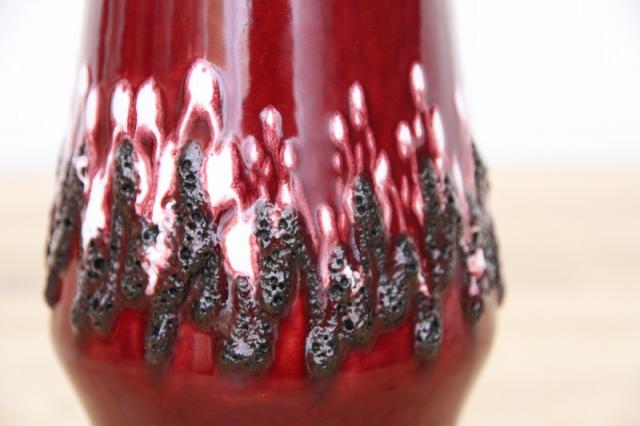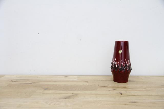 ドイツ製ヴィンテージのFatLavaテイストなフラワーベース。赤ワインのような赤の色がとっても印象的。ジグザグと黒と白の泡の釉薬が特徴あるデザインです。