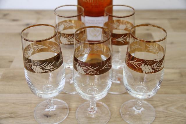 ドイツから届いたヴィンテージのワイングラス。ゴールドの帯に描かれた葡萄は、切子細工のようにガラスをカットされたデザイン。脚部分のガラスもカットされていて、大変美しいフォルムです。