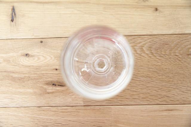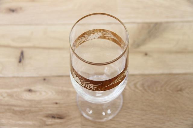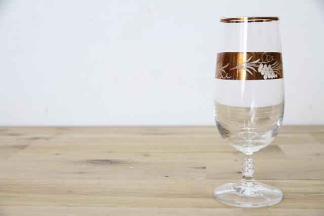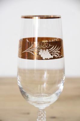 ドイツから届いたヴィンテージのワイングラス。ゴールドの帯に描かれた葡萄は、切子細工のようにガラスをカットされたデザイン。脚部分のガラスもカットされていて、大変美しいフォルムです。