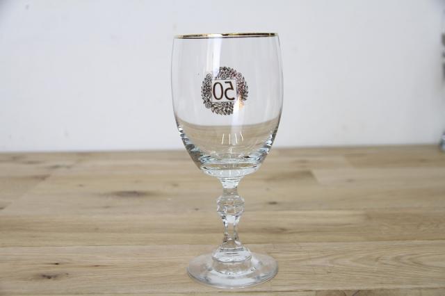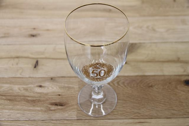 ドイツで見つかったヴィンテージの脚付きグラス。デコレーションされた50の文字、なにかの記念品だったのでしょうか。50歳のお誕生日、ご結婚50年のお祝い、創業50年のお祝いなどなど、ギフトにもおススメです。