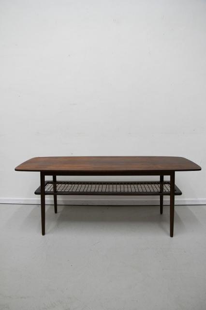 1960~70年代製の北欧デンマーク製のコーヒーテーブルです。なんともローズウッドの木目が美しく、凛とした佇まいを感じるテーブル。天板はローズウッドの突板、棚板のフレーム部分や脚は無垢のローズウッドが使われています。
