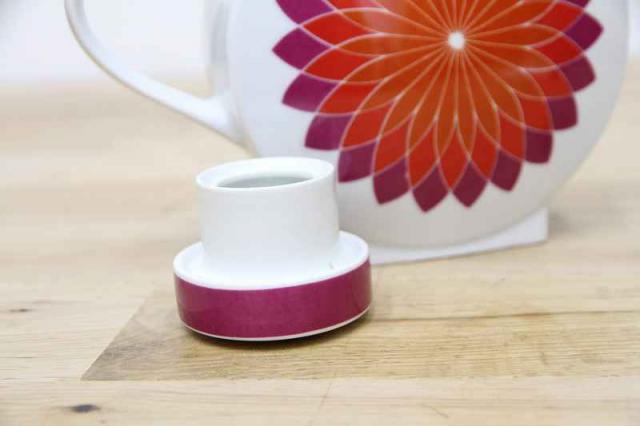 ドイツMelittaメリタ社製ヴィンテージのコーヒーポット。なんといっても目を惹くのはダリアのような大輪のフラワーモチーフプリントと、まんまるボディでしょうか。横からみると案外スリム。インテリアとしても映えるコーヒーポットです。