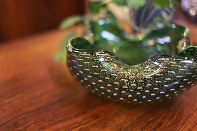 1970年代製のMuranoGlassの灰皿(ボウル)です。ずっしりとした重みと、ガラスの美しい緑の色の中には金粉の含有物。とても高貴な雰囲気を醸し出しています。ガラスの塊の中に気泡を閉じ込める技法も大変高度な技術を要するそうです。