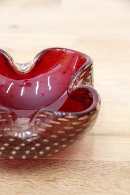 1970年代製のMuranoGlassの灰皿(ボウル)です。ずっしりとした重みと、ガラスの美しい赤の色の中には金粉の含有物。とても高貴な雰囲気を醸し出しています。ガラスの塊の中に気泡を閉じ込める技法も大変高度な技術を要するそうです。