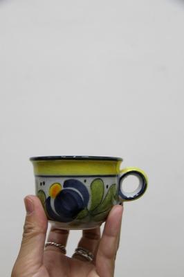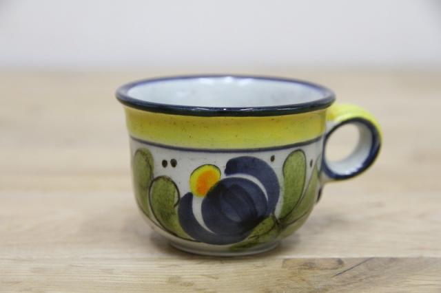 ドイツから届いた小さくてかわいいマグカップ。ブルー、イエロー、グリーンの色使いが目を惹きます。ハンドペイントによるフラワーモチーフは大変美しい一点です。